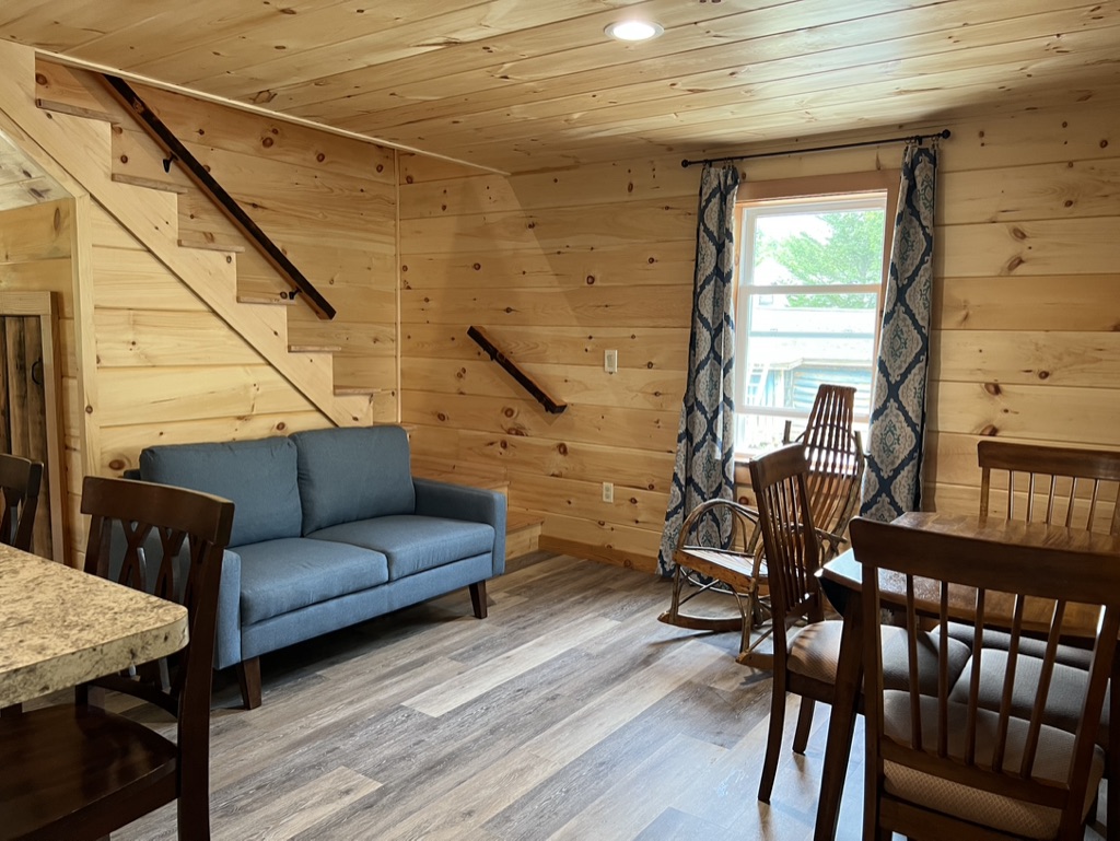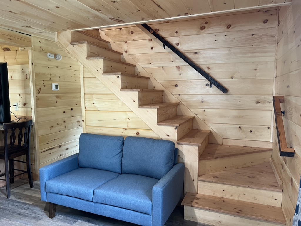The first floor has an open concept living area with a fully equipped kitchen and a sitting/dining area, bedroom with (1) queen bed, and bathroom. The kitchen has a refrigerator, gas stove with air fryer feature, microwave, drip coffee maker, toaster, and all necessary cookware and dishes including utensils.